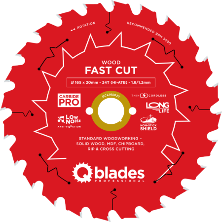 QCZ16502T – Lame de scie circulaire – Ø 165 × 20mm – 24T HI-ATB – 1.8/1.2mm – Sans fil