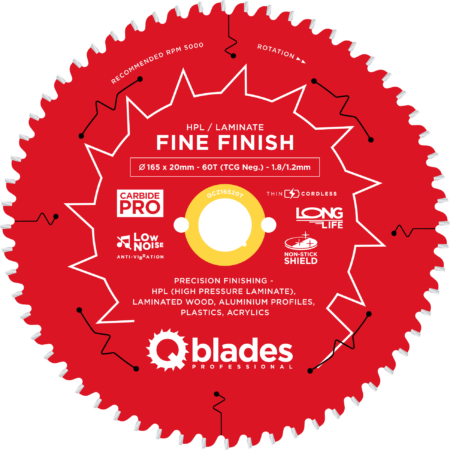 QCZ16520T – Lame de scie circulaire – Ø 165 × 20mm – 60T TCG Neg. – 1.8/1.2mm – Sans fil